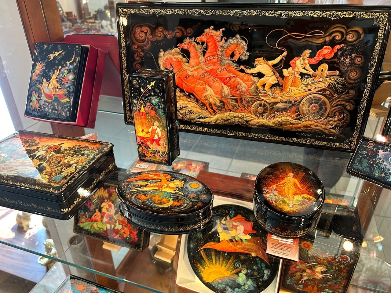 Интересный факт о Федоскино: мастера этого села используют уникальную технику росписи, которая включает в себя наложение нескольких слоев краски и лака. Это позволяет создавать эффект глубины и объемности изображения, что делает изделия особенно выразительными. Еще одной особенностью федоскинской миниатюры является использование перламутра и золота для украшения изделий. Эти материалы придают шкатулкам особый блеск и роскошь.